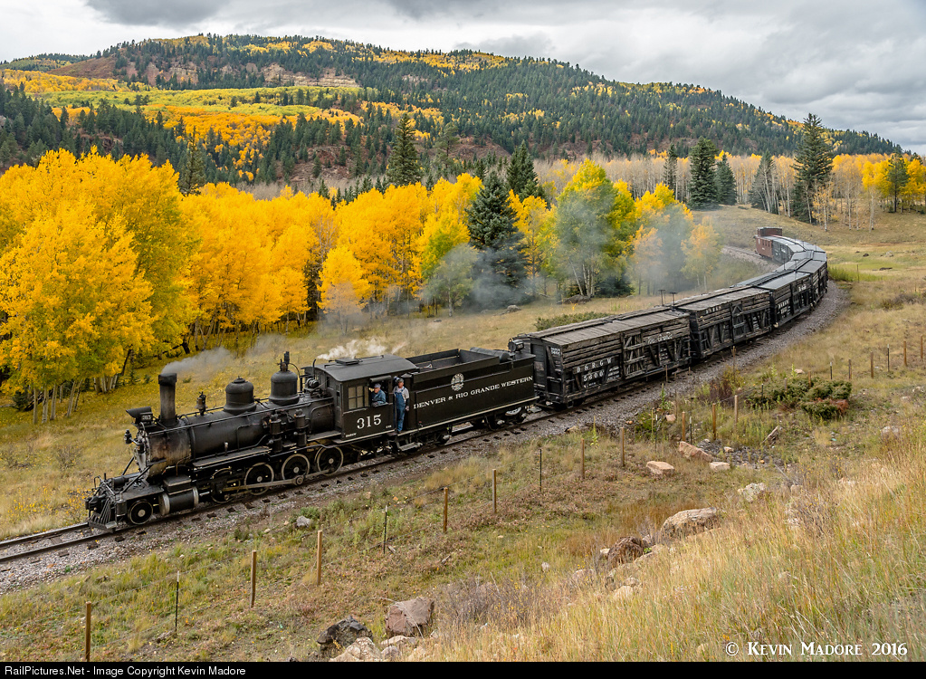 Almost home.... With their coal bunker all but empty, and the heavy lifting pretty much done, Firemen Olaf and Dave can pretty much relax for the last three miles and change as DRGW 315 and her stock train drift down past Lake Lobato and the beautiful grove of aspens beside it.