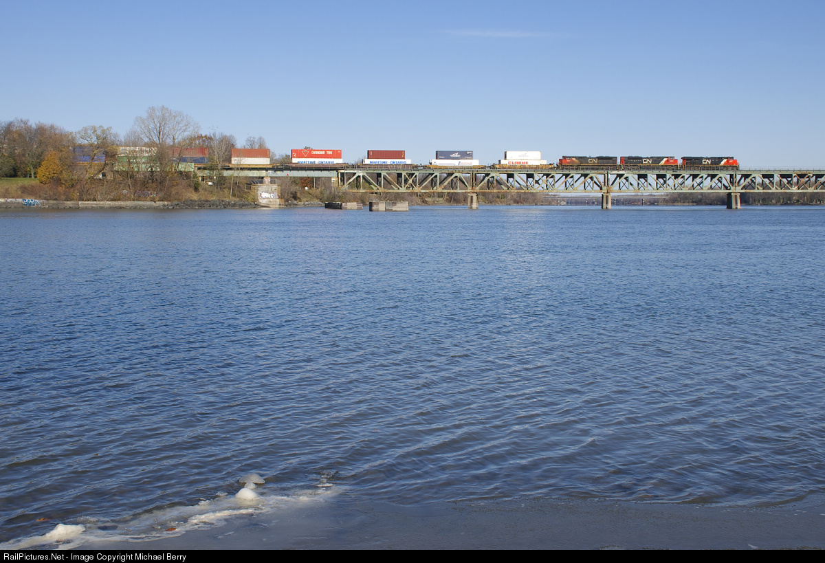 CN 120 has a long train (656 axles) and 3 units up front (CN 2857, CN 8835 & CN 8011) and another mid-train (CN 2970) as it crosses the Richelieu River a bit before noon on a cold but sunny morning.