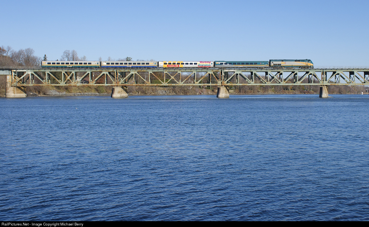 4 LRC cars, 4 paint schemes. VIA 622 has unwrapped VIA 902 leading 4 LRC cars in 4 different paint schemes at it crosses the Richelieu River at Otterburn Park.