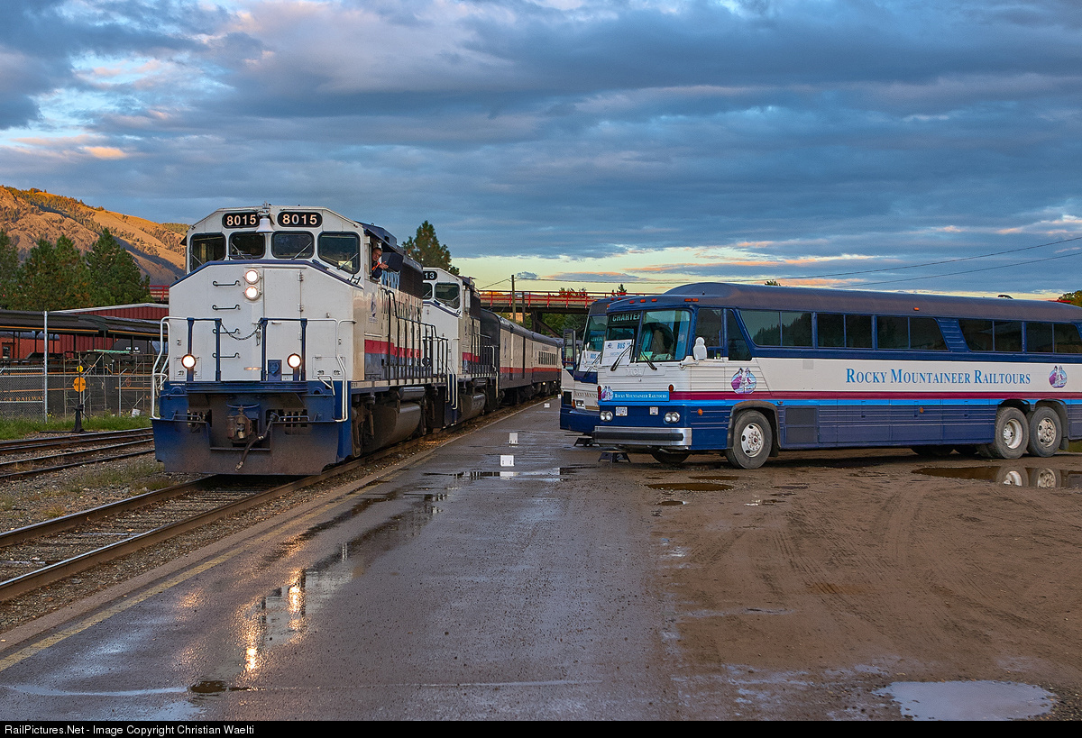RMRX 8015 (EMD GP40-2LW) with Rocky Mountaineer Railtours train No. 101 (Calgary - Banff - Kamloops) pulling into Kamloops while busses are waiting for the passengers.