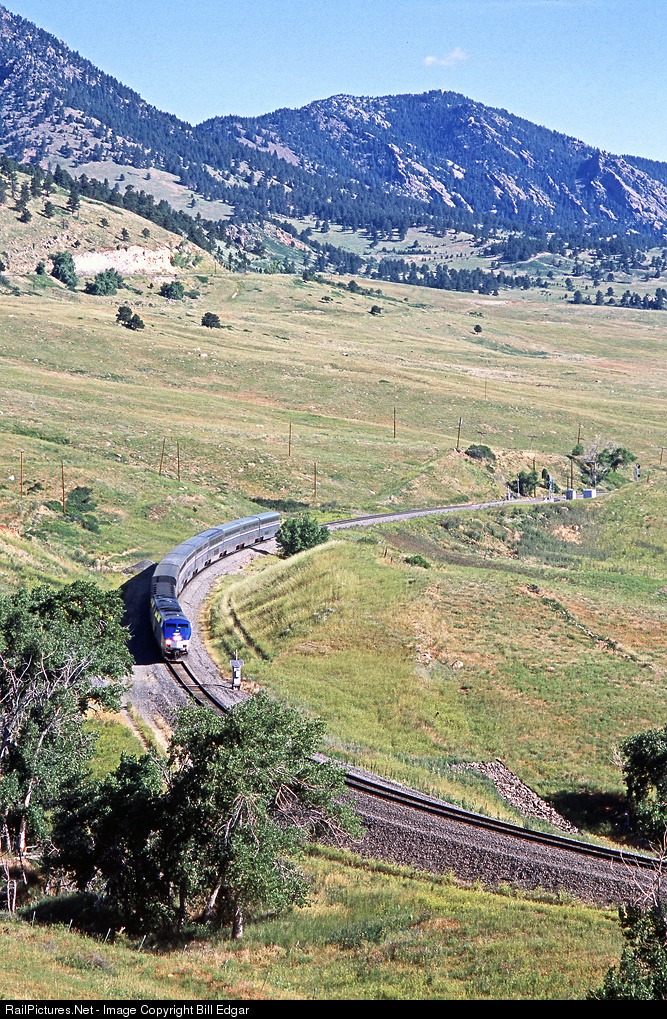 Heading east to go west, the California Zephyr leaves Rocky and heads toward Big 10 curve on the beginning of its Front Range climb out of Denver. The cut in the hill above is Clay siding.
