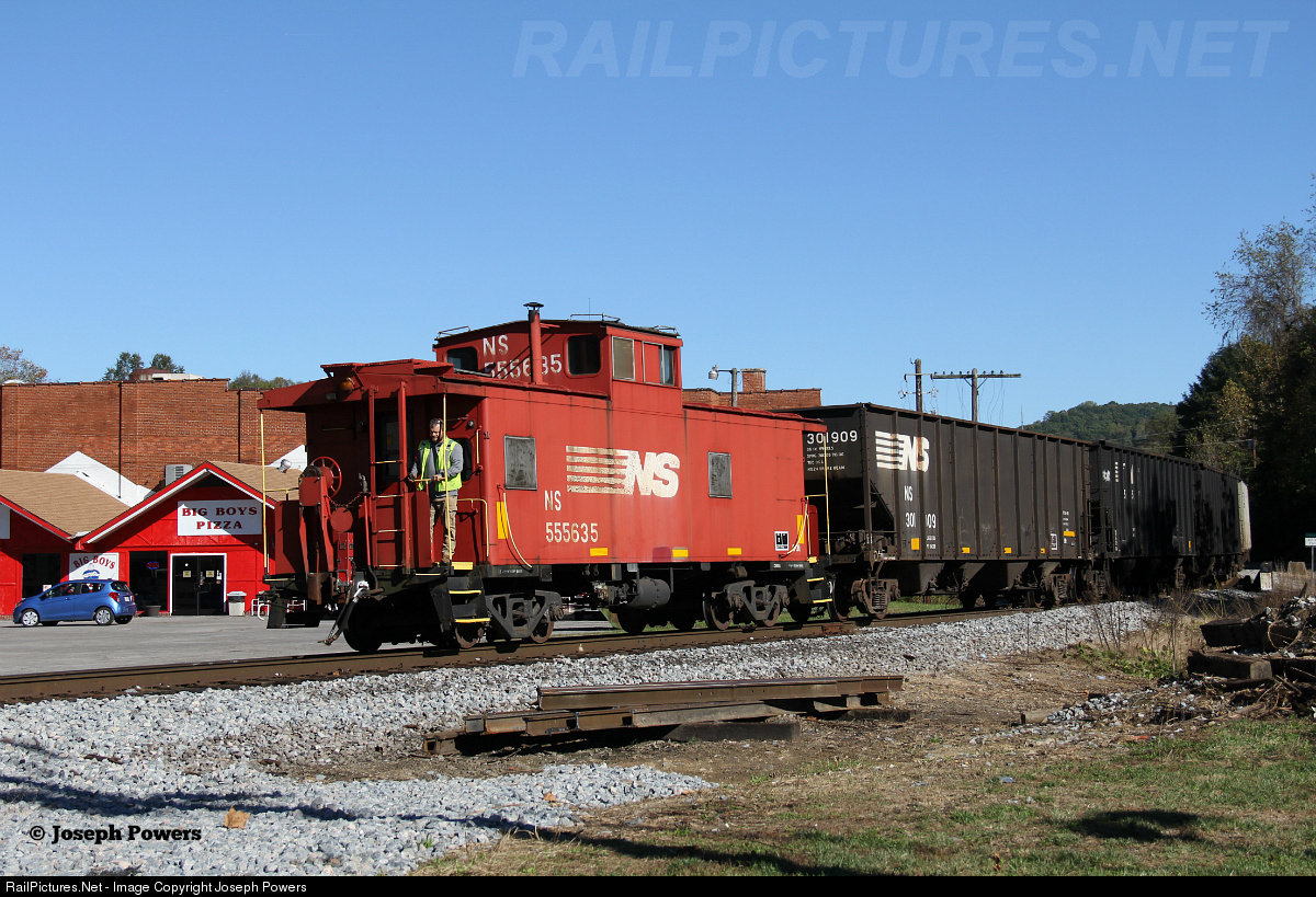 The conductor of NS U45 rides on the platform of the caboose as the empty coal train makes a reverse move off of the Clinch Valley mainline and onto the Big Toms Creek Branch. The train is about to cross Front St. in downtown Coeburn, VA and is heading toward the end of the branch for flood loading. The switch for the branch is roughly a dozen cars or so from the caboose into the train.