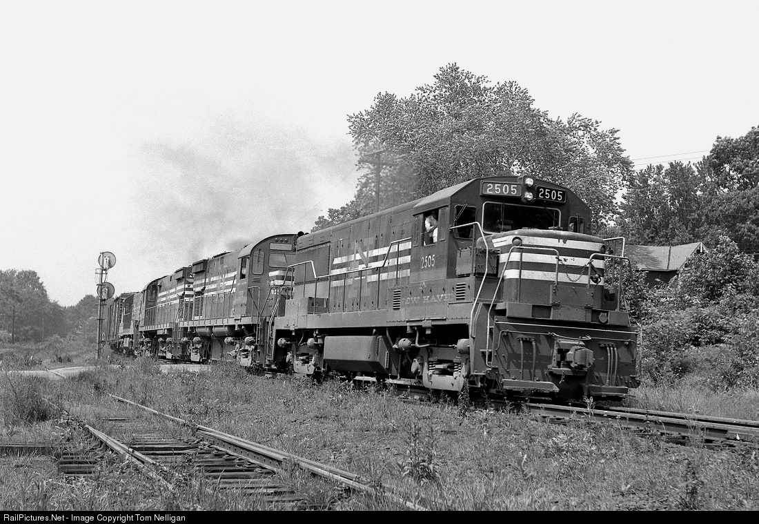 A four-unit GE/Alco lashup leads New Haven train Advance OB-2 (Maybrook, NY, to Boston) through Brewster, NY, on a summer afternoon. A/OB-2 was a hot freight forwarding interchange traffic from the Erie Lackawanna and Lehigh & Hudson River. Two U25Bs bracket a pair of Century 425s. The track in the foreground is a remnant of a onetime connection to the NYC Harlem Division at this point.