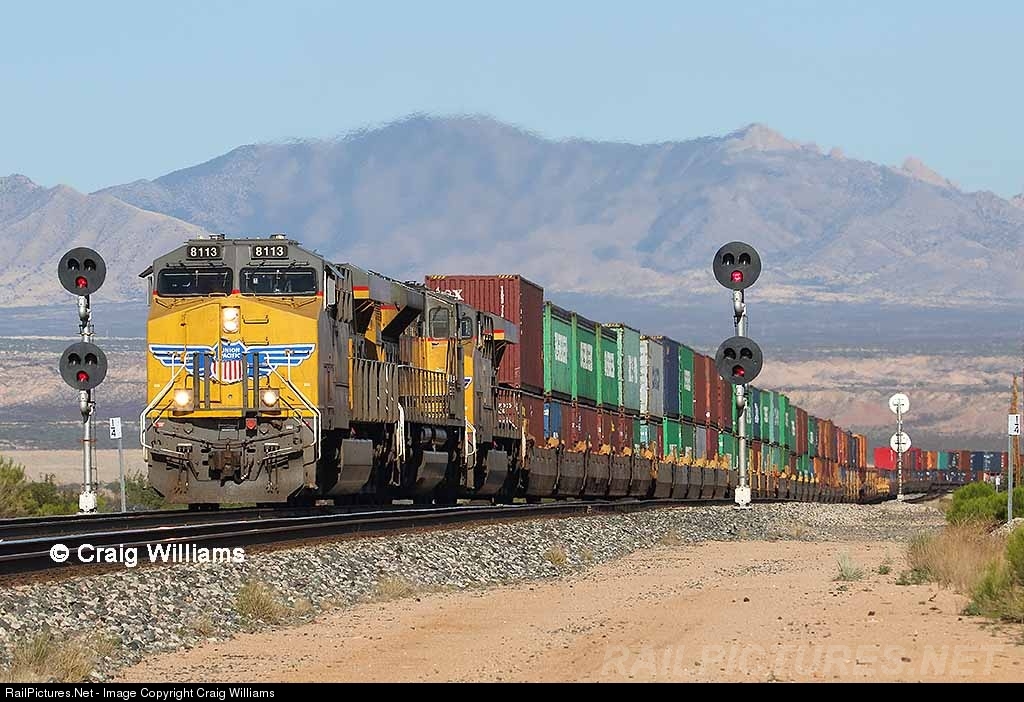 | The UP Lordsburg Sub is part of the Sunset Route that runs from Tuscon to El Paso. This westbound stack train is crawling up the 1.15-1.6% grade out of Benson. Here the train passes thru the xovers at Chamiso, MP 1029. 4 units (3x1) are doing the best they can to keep this freight moving west. |