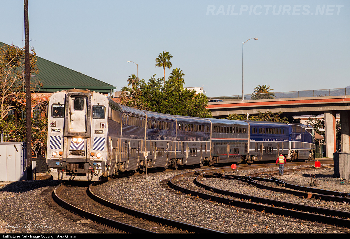 | Highballing the Oxnard Transit Center as it turns into the morning light, Amtrak 768 heads south for its next station stop of Camarillo. In the background, the LOF63's conductor walks toward the platform where he'll rejoin his train that's currently backing out onto the main out of picture to the right. |