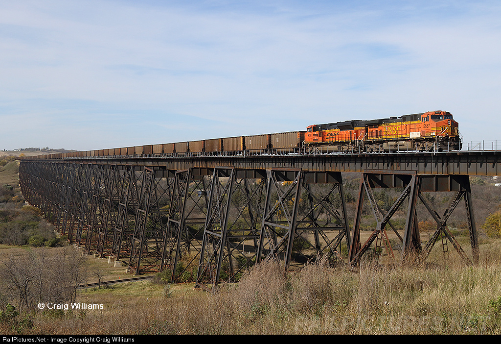 | A pair of DP units shoves on the back of this Superior to Deck Mine empty coal train on the Jamestown Sub. The train is crossing the massive bridge over the Sheyenne River at Valley City. The bridge is 3,860 feet long and 162 feet above the river. Construction work began on July 5, 1906 and it was completed on May 8, 1908. The CP Carrington Sub crosses under the bridge on the east end. |