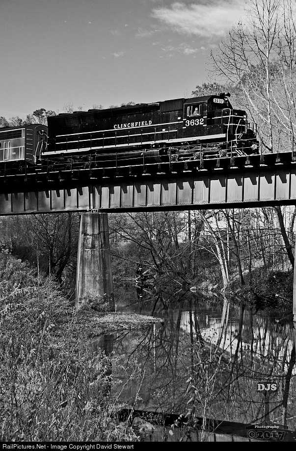 Along with the CSX 75th Anniversary Christmas Train Special came a look into the past of the former Clinchfeild Railroad, several joint efforts made the power for this year's train possible to bring back the line's heritage for a weekend for all to see. Vintage Locomotive Incorporated's restored EMD built SD45 2024 served as "CRR 3632" which is seen at Clinchco, Virginia above the McClure River on November 17, 2017. |