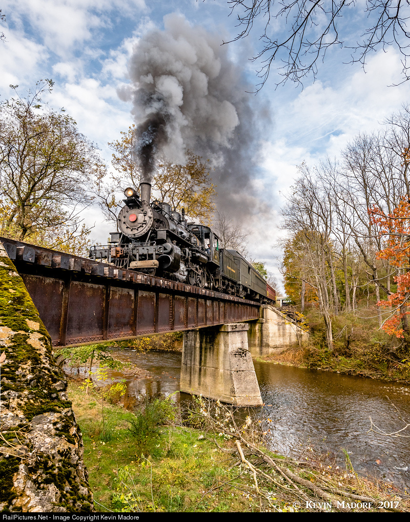 On the road to Claysburg. An Everett Railroad Passenger Train led by Locomotive #11 rumbles across the iron bridge over Halter Creek on a run south toward the company yard at Claysburg. The sheds at Claysburg are home to #11, when she's not running excursions, so while it is not unusual to see her on this trestle, it is very unusual to see her with a train here. That's because most of the line's passenger excursions travel to either Brooks Mill or Roaring Spring, so the passenger cars almost never see this branch of the railroad. The Everett Railroad is primarily a freight line, but since the restoration of #11 a couple of years back the company has slowly been expanding its offering of steam-powered excursions, not only during the summer and fall, but also during the holiday season in December. It's great to see steam operations return to a part of Pennsylvania that has a rich history of steam railroading.