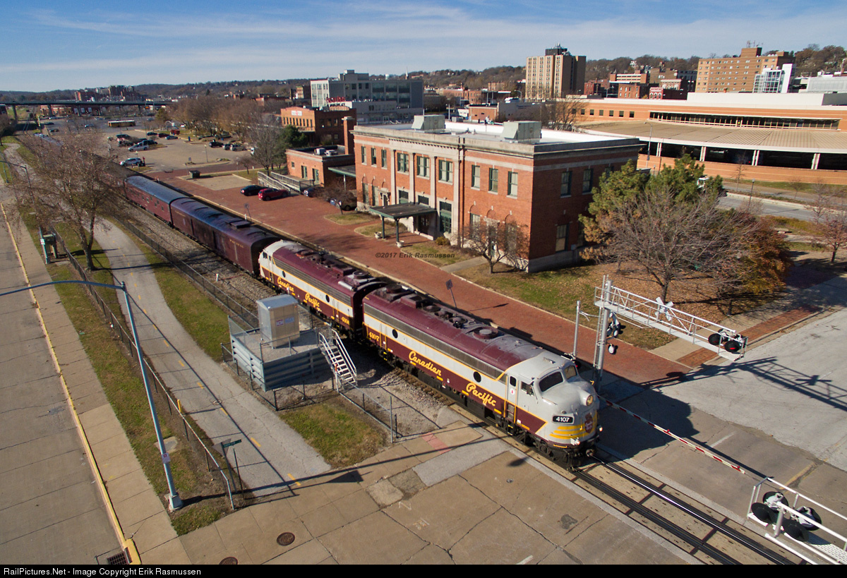 Canadian Pacific FP9's 4107 and 4106 pass the former Davenport Union Station on their deadhead move from Kansas City to Calgary.