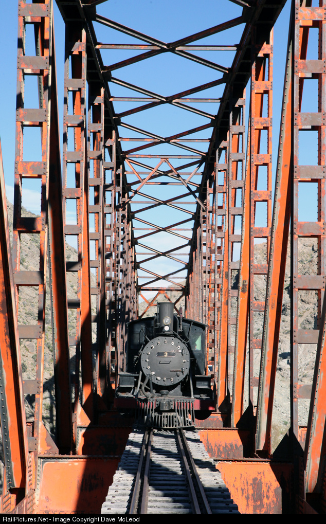 Baby Baldwin # 3 crosses the Rio Chico on one of the few bridges in this very arid area. The 30" gauge line only runs for charters, this trip was organized by Bernd Seiler of Farrail Tours, an excellent operator.