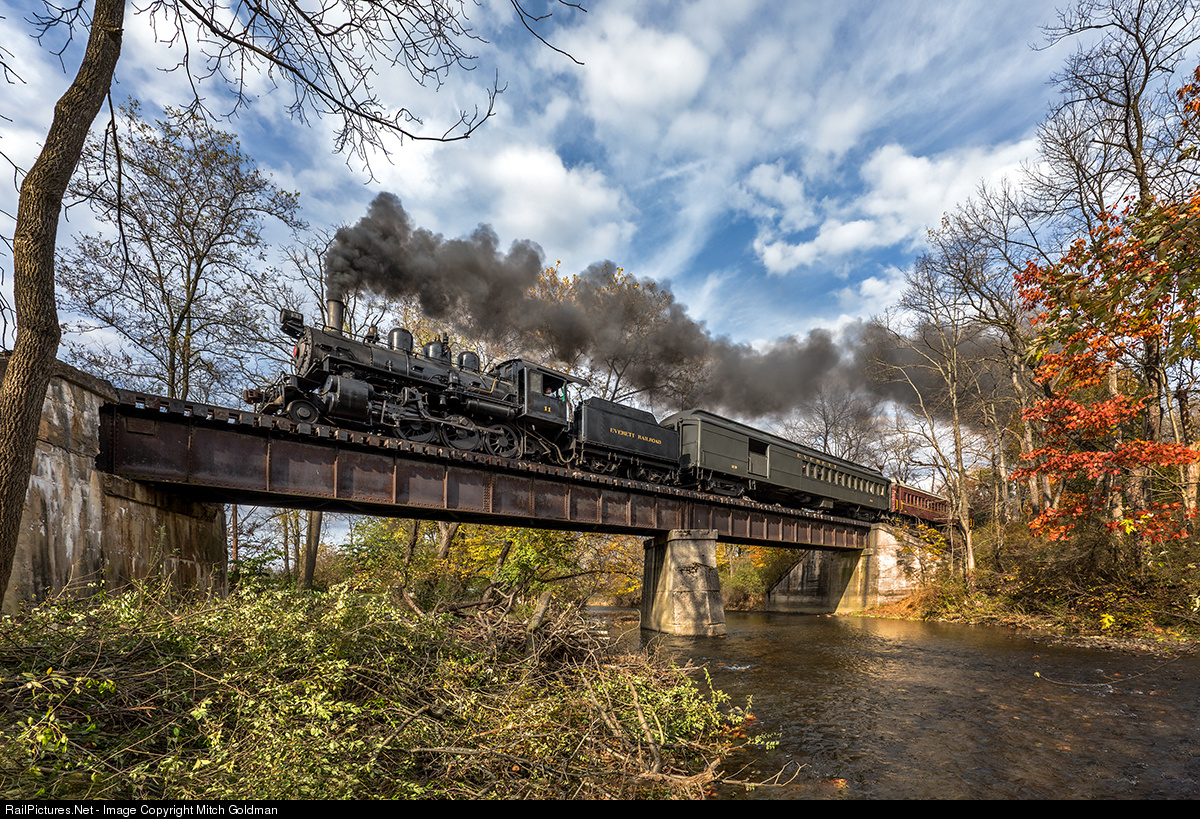 Everett Railroad's 2-6-0 "Mogul" No. 11 travels southbound over the Halter Creek trestle in East Freedom, PA toward the company yard at Claysburg where the locomotive is stored. While this portion of the line sees No. 11 in deadhead moves to Hollidaysburg, it rarely sees passenger excursions. The scene above was captured during a 2-day charter sponsored by Lerro Productions.
