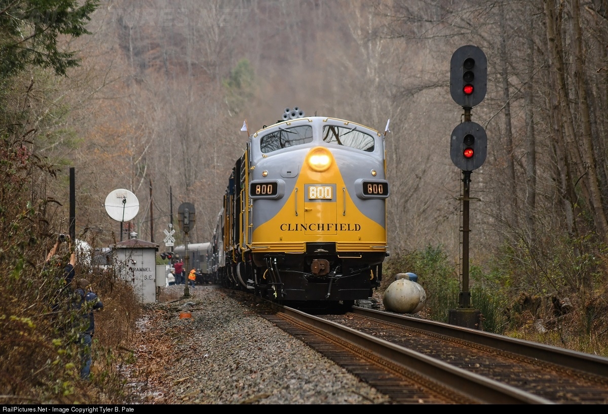 | The 75th anniversary CSX “Clinchfield” Santa Train is southbound just north of their next stop of Dante, Virginia, while en-route to a final stop in Kingsport, Tennessee. Here CSX P901-18 is knocking down the South End of Trammel siding with Clinchfield No.800 (F7A) leading an EMD SD45 also wearing Clinchfield paint No.3632. |