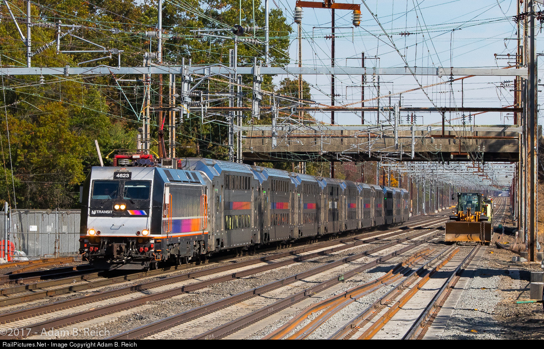 Track Work in Progress: Northeast Corridor Line Train 7837 arrives at Princeton Junction on Saturday, October 28, 2017. Note the replacement rails on Track 1, which are being installed as part of the New Jersey High-Speed Rail Improvement Project and the presence of the bulldozer in the distance.