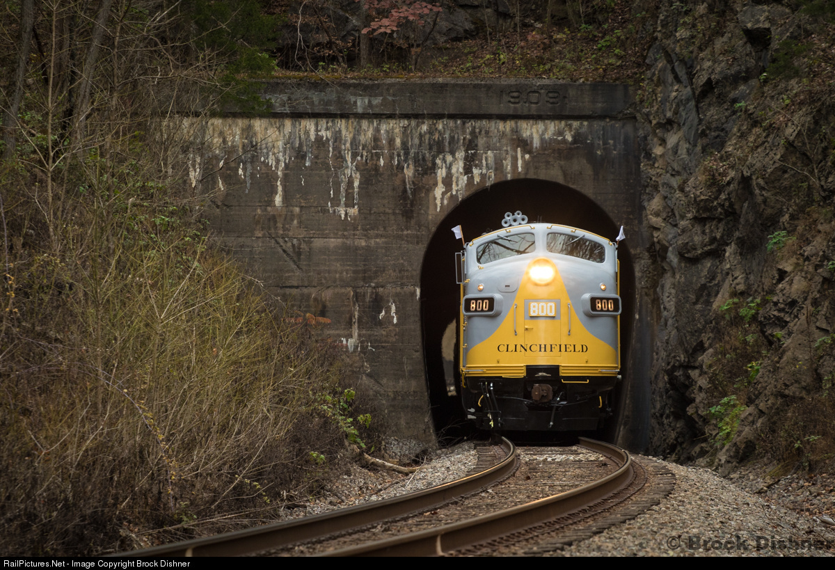 The 108 year old tunnel at Miller Yard yet again sees a Clinchfield painted F-Unit. The 800 poses in it's original CRR gray and yellow paint scheme.