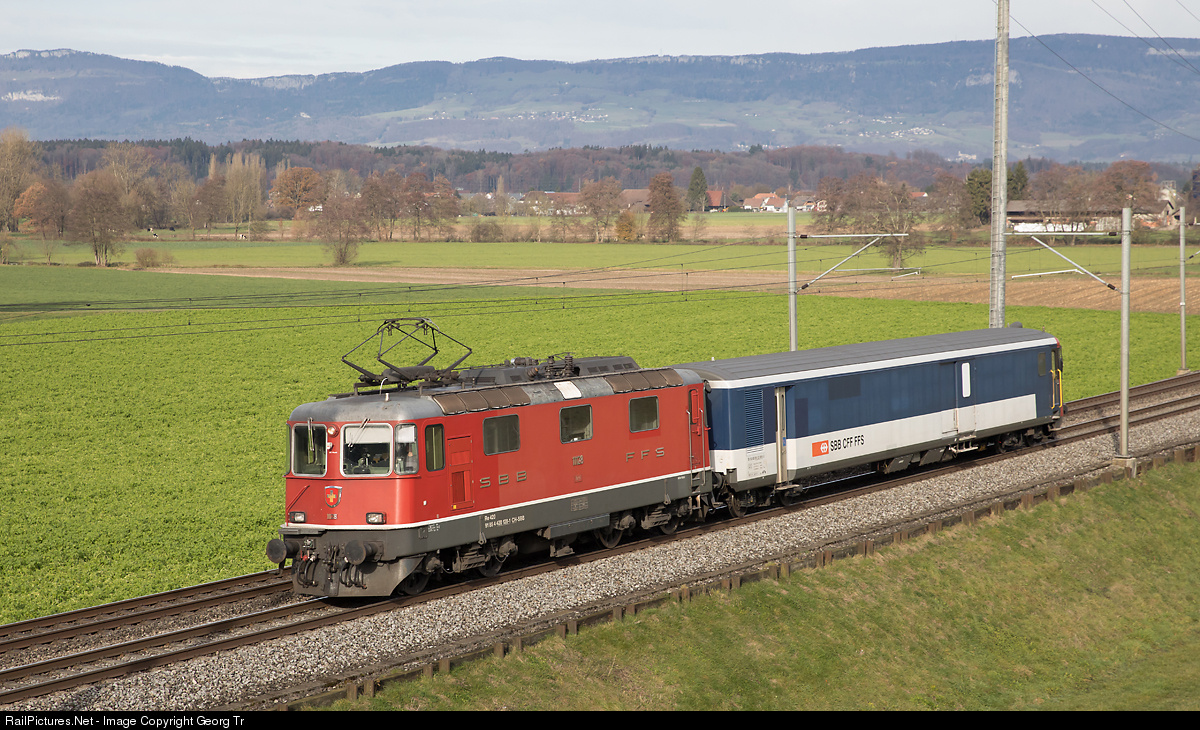 | Re 4/4 II # 11128 of the SBB with the short "Jail Train" from Bassersdorf to Bern Weyermannshaus, near Bollodingen. The cab car St 89-33 900 is used for the journey of prisoners and detainees. |