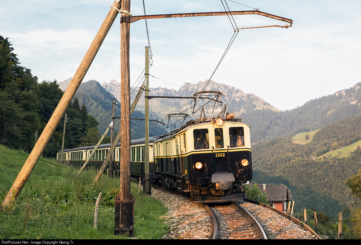 Heavy articulated railcar with baggage and mail compartment FZe 6/6 # 2002 of the Blonay-Chamby Railroad Museum (BC) with a GOLDEN MOUNTAIN PULLMAN EXPRESS on the MOB line between Sendy-Sollard and Chamby. This sixaxle 810 kW railcar was built by SIG and BBC in 1933 for the Montreux-Oberland-Bernois (MOB), to pull the Golden Mountain Pullman Express between Montreux and Zweisimmen. This train was introduced in may 1931, but cancelled already in the autumn of the same year because of the world economy crisis and lack of passengers. So in fact this railcar never pulled the timetabled Pullman Express, but there were made some publicity photos in the 1930' with this composition. In the evening of the 8th september 2017, such a train was arranged for photographers by the MOB (4 Pullman cars) and the Blonay-Chamby (railcar FZe 6/6). The railcar # 2002 is running for the BC since 2008 and is beautyfully restored. The 4 cars of the MOB are not original, but modern rebuilts in the appearance of the cars from the 1930'.