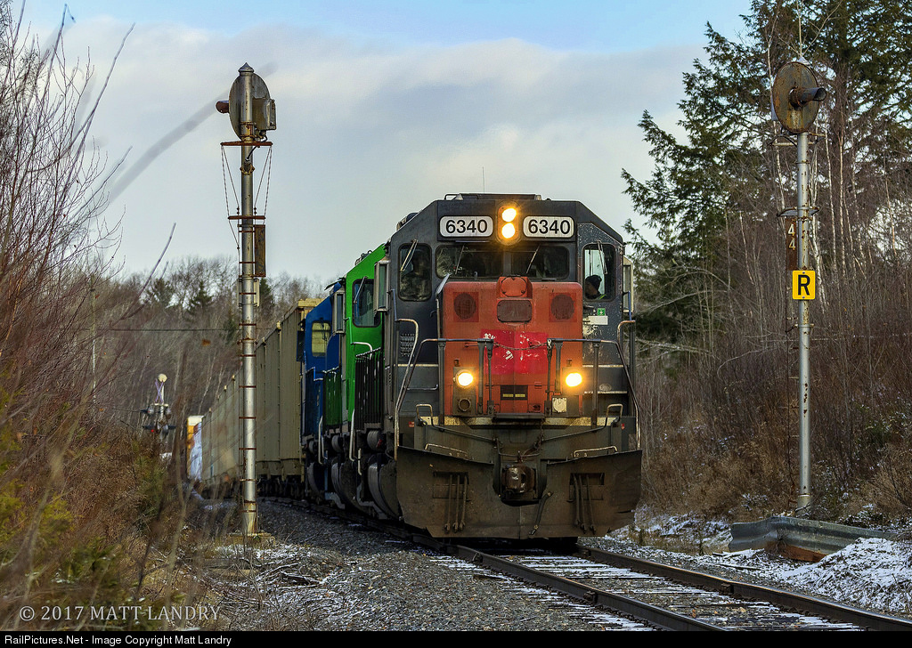 | NBSR 6340 leads a New Brunswick Southern Railway westbound freight past an old set of signals at mile 4.4 of the Mattawamkeag Sub, shortly after a crew change at McAdam, New Brunswick. |