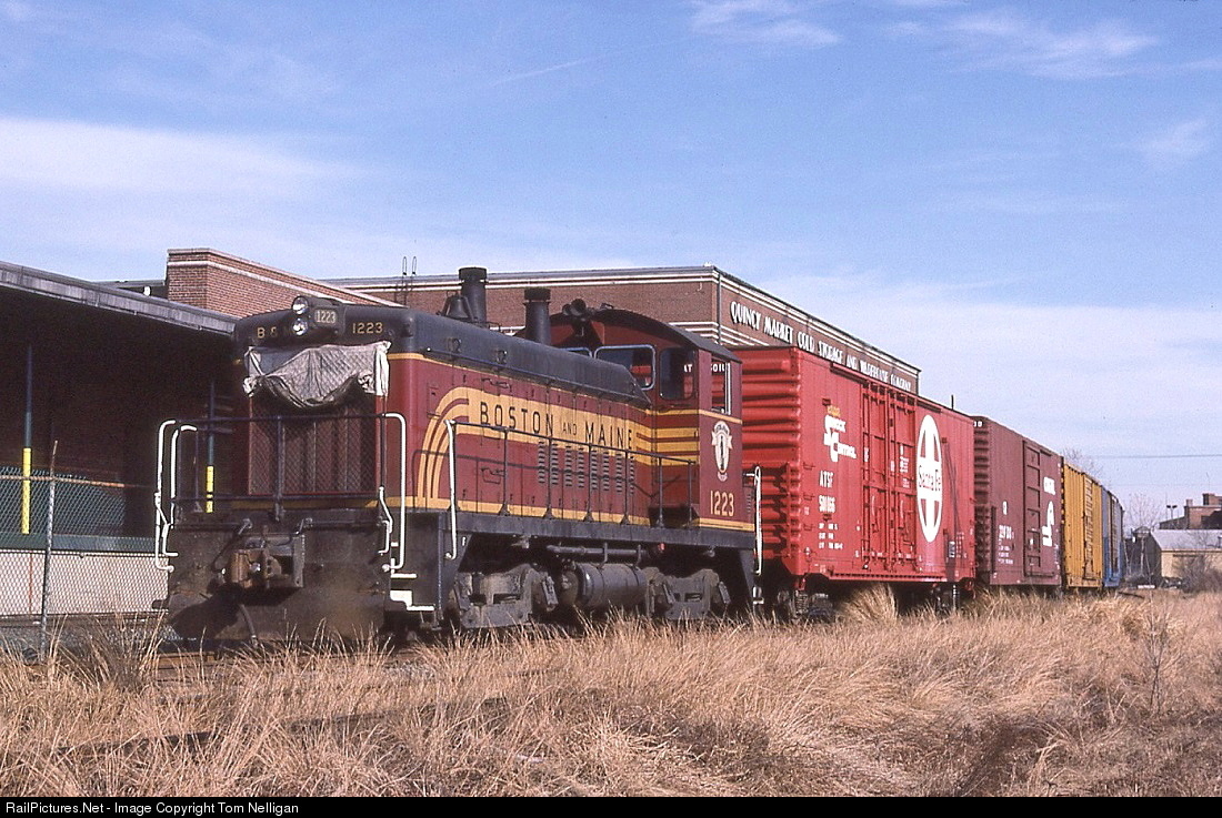 | One of the first "heritage" repaint projects involved Boston & Maine SW9 1223, which was repainted into its original 1952 maroon and yellow colors in the early 1980s through funding provided the Amherst Railway Society. A few years later it was in charge of local freight BO-1 working the now abandoned Bemis branch in Watertown, MA. |