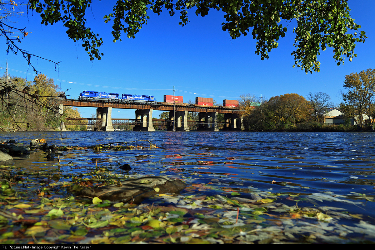 Fresh from the paint booth, UP's Olympic Units are in charge of Global 2 - Global 3 shuttle as it crosses the Fox River in Geneva.