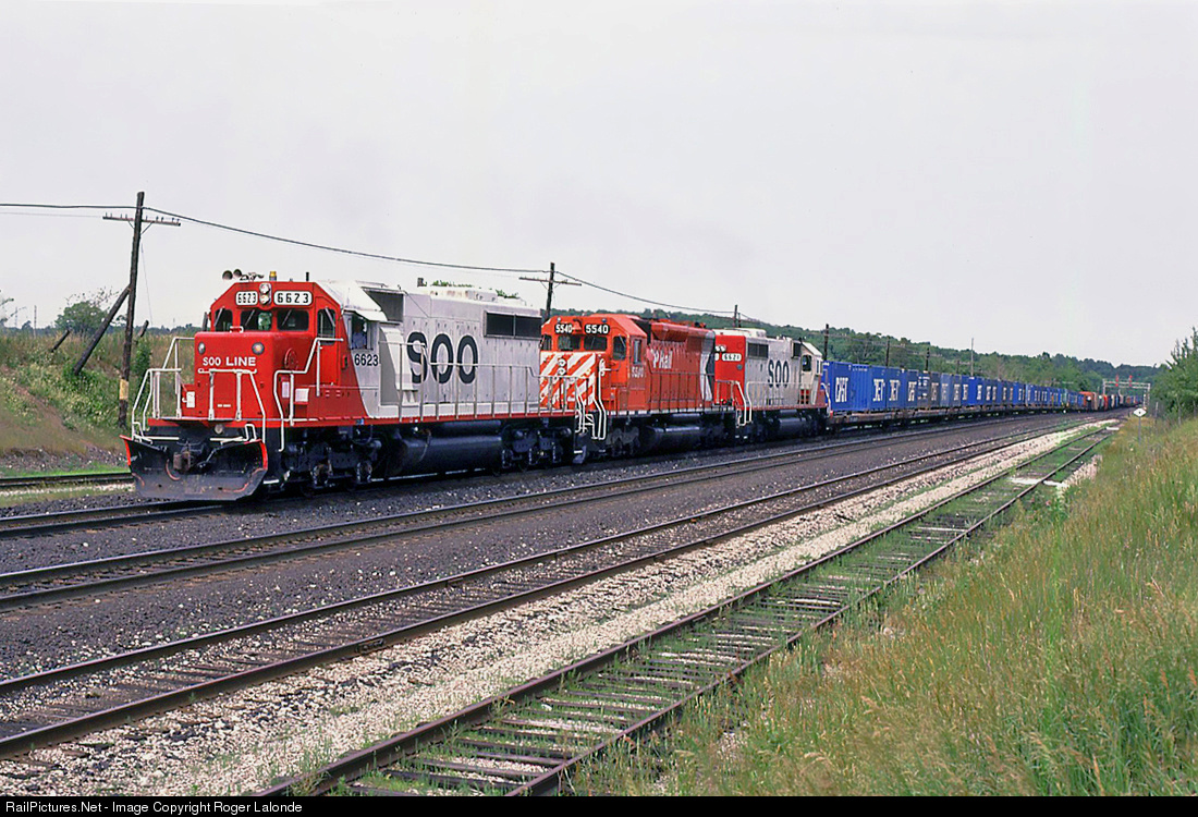 | Soo Line SD40-2 6623, CP SD40 5540 and Soo Line 6621 westbound at Guelph Jct., Ontario |
