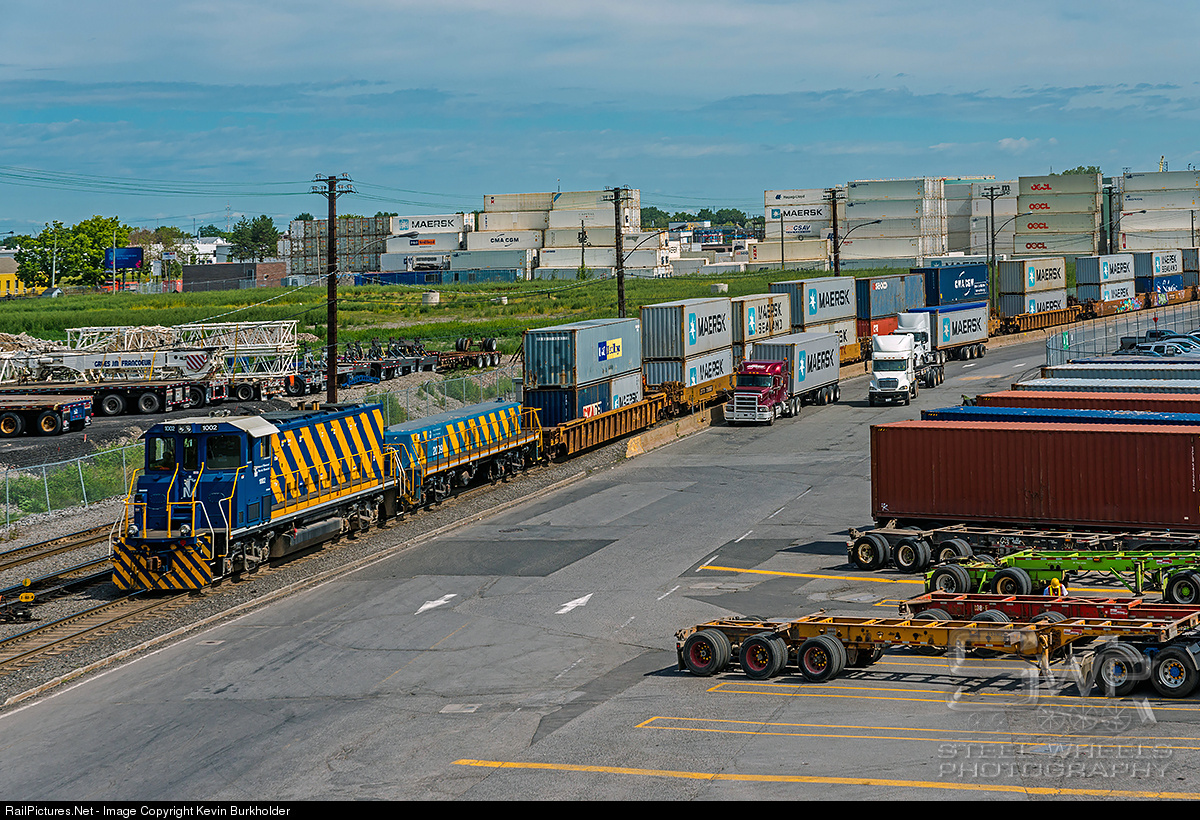 | The Port of Montreal Railroad's RP20BD #1002 and slug handle a cut of double stack cars in the North Port section of the Port of Montreal, as trucks await their departure or arrival ramp space nearby. Photo taken on private property and accompanied by POM personnel by invitation. |