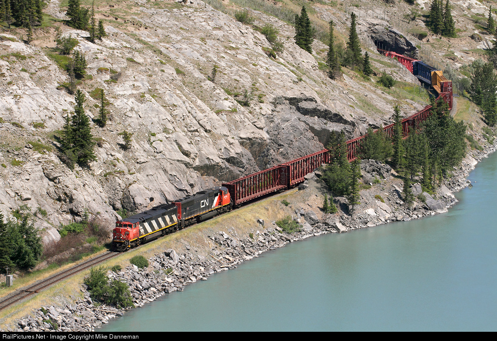 On the afternoon of July 12, 2014, GE C40-8M “cowl” No. 2403 leads Canadian National train No. 347 through Brule Tunnel toward Park Gate, Alberta, entering Jasper National Park.
