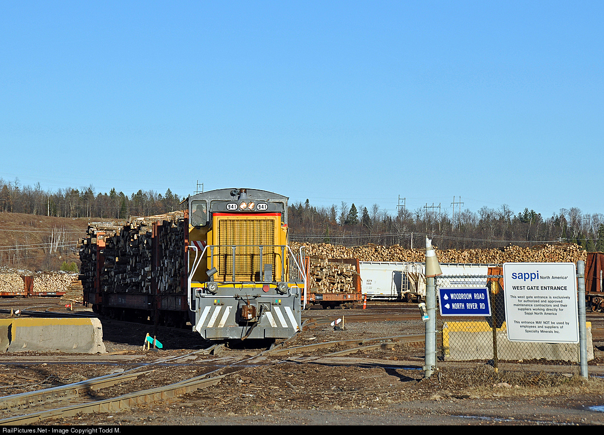 | The Cloquet Terminal has acquired a "new" MP15DC from ILS and has put the unit in service replacing what was their biggest engine, SW1000 #35, to switch the Sappi fine paper mill. Here the new toy pulls loaded log cars that will feed the mill. |