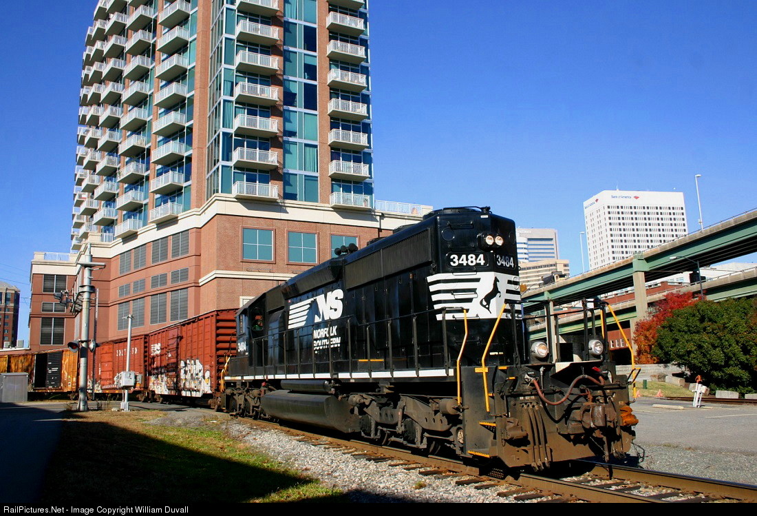 V28 with NS SD40-2 3484, running long hood forward, crosses over 14th Street. NS 3484 was originally built as BN 7280 in 1980 and has operated under five owners: Burlington Northern, BNSF, First Union Rail, National Railway Equipment and Norfolk Southern.