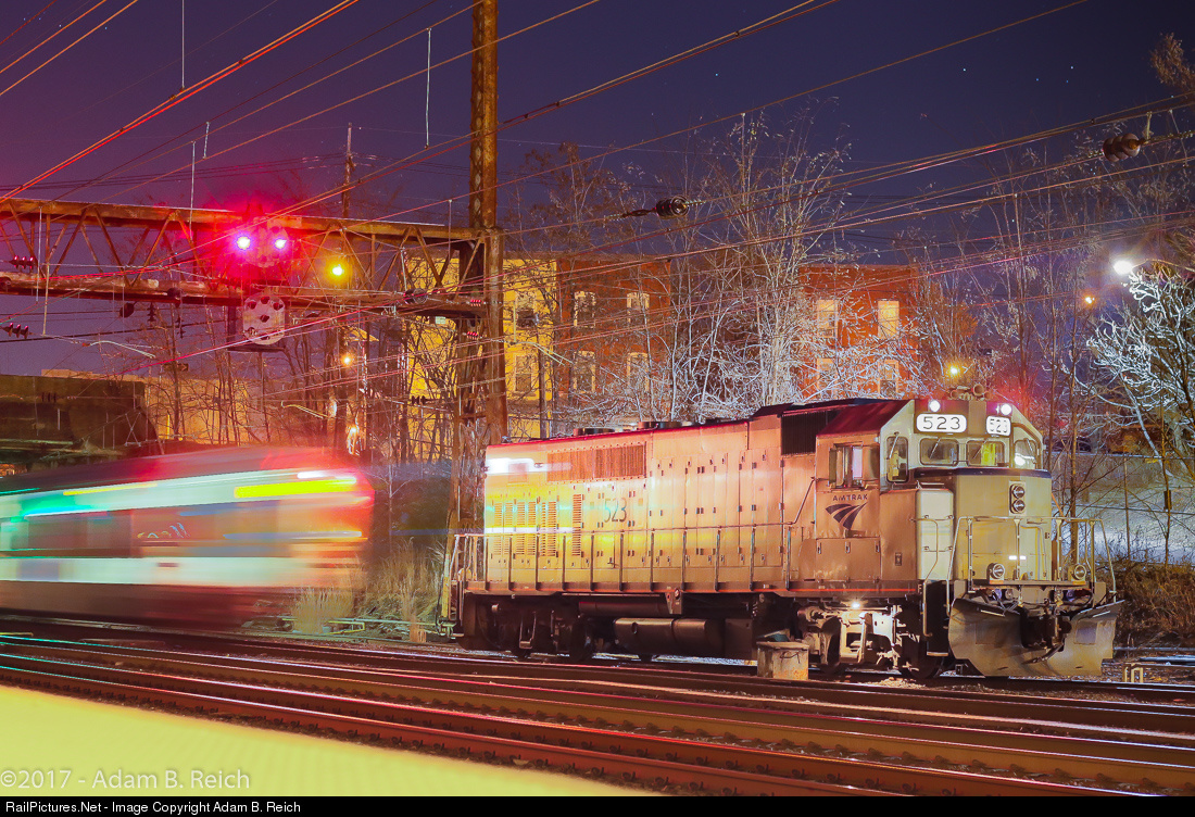 Fade Away and Radiate: NJ Transit Northeast Corridor Line Train 7857 approaches the Trenton Transit Center on Track 4 and illuminates Amtrak GP38H-3 #523, which is standing by as a protect unit positioned at the station for the busy Thanksgiving travel season.