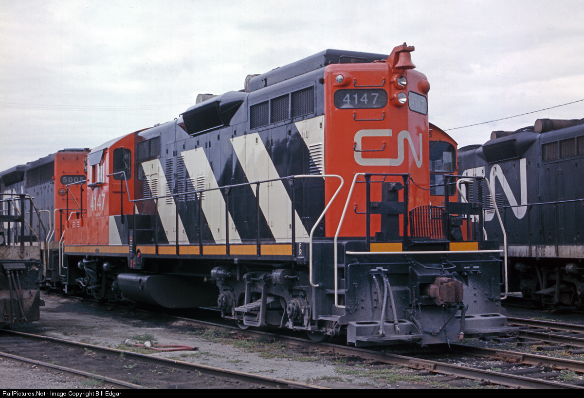 CN 4147 shows off its new color scheme at North Kamloops, BC in August 1975. The unit appears to be a later model Geep, featuring a large winter hatch which would cover a single 48 inch fan rather than the older 36 inch ones. It's also capable of handling lighter trackage as noted by the small fuel tank. It does feature regular Blomberg trucks, while many sister units had a version used under SW1200RS switch engines.