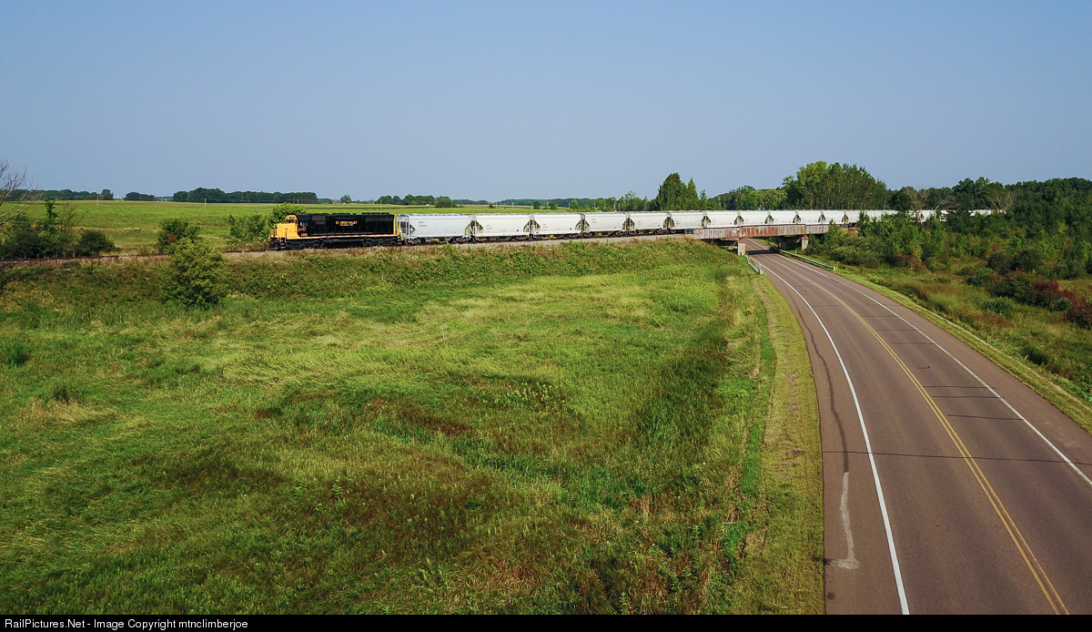 The St. Croix Valley uses a single SD40M-2 to bring a sand train south from BNSF, seen here with a drone view crossing over Route 30.