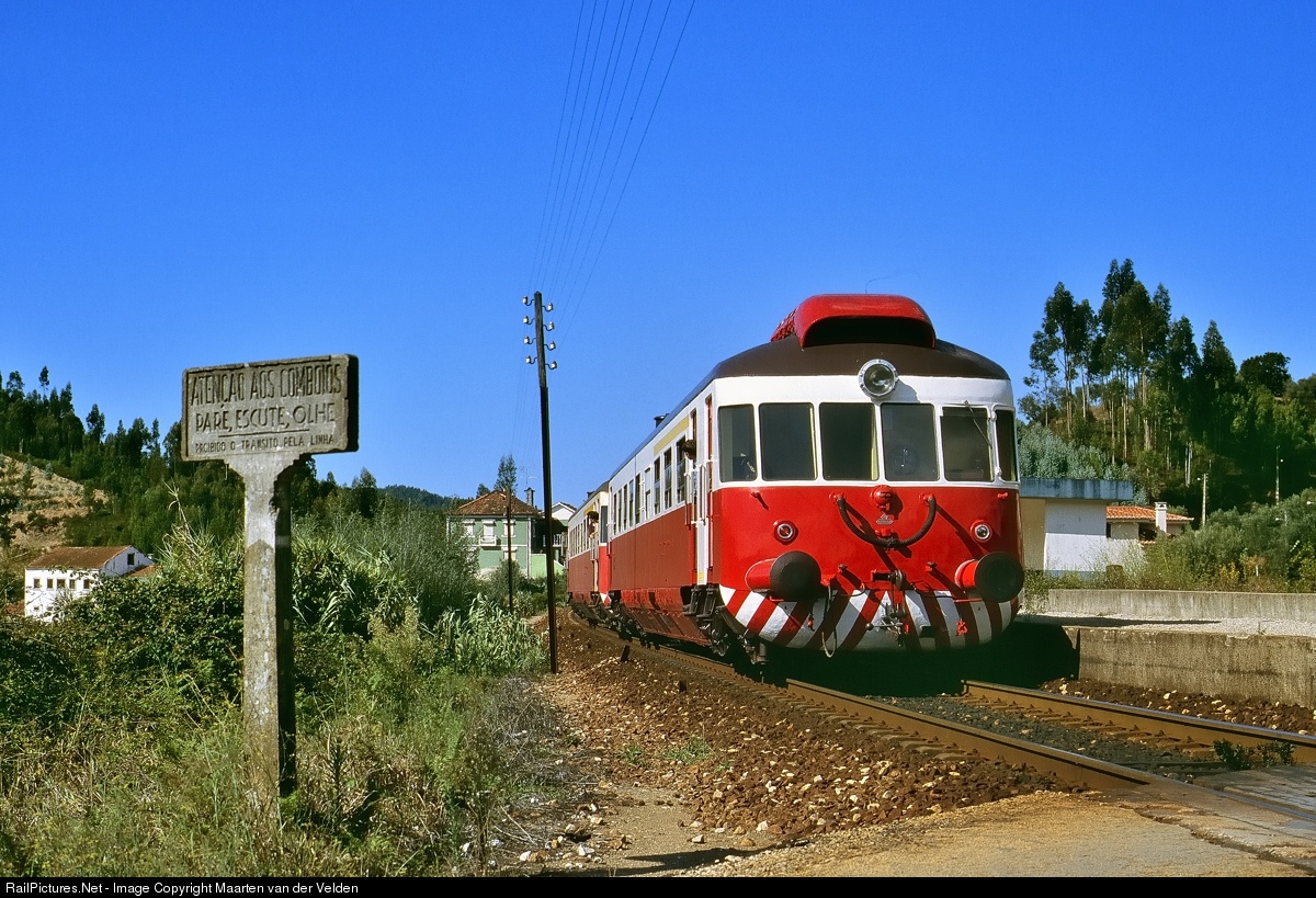 | CP 314 and 307 at Lobazes on their way as Regional 6518 from Serpins to Coimbra-Parque (ap.). On the left a tipical Portuguese sign waht is standing often by a level-crossing. The tekst means "Attention for the trains, stop, listen and look, walking alongside the line is prohibeted". In those days probably the most made offence by Portuguese people.