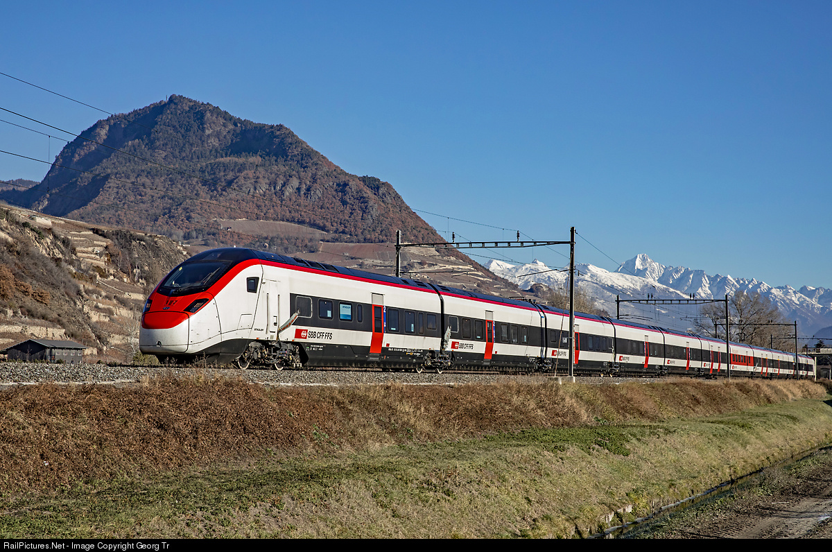 "Giruno" # 2, RABe 501 # 002 of the SBB, built by Stadler Rail, is used for running gear testruns, fitted with measuring axles, sensors, wires, measuring devices and loaded with many sand bags. The train is running from Bern Weyermannshaus via Lötschberg mountain line to Brig and through the Valais to Martigny. The train is between St-Léonard and Sion with the 3934 meter high Bietschhorn in the background.