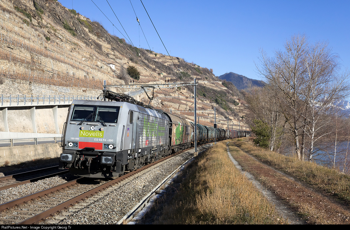 189 # 990 or ES 64 F4-090 "Göttingen" of MRCE in "Novelis" paint scheme, rented by SBB Cargo, with the about 1600 ton "Novelis" aluminium train 68740 (about 2 hours late) from Sierre to Göttingen, via Lausanne-Solothurn-Olten-Basel, near Sion.