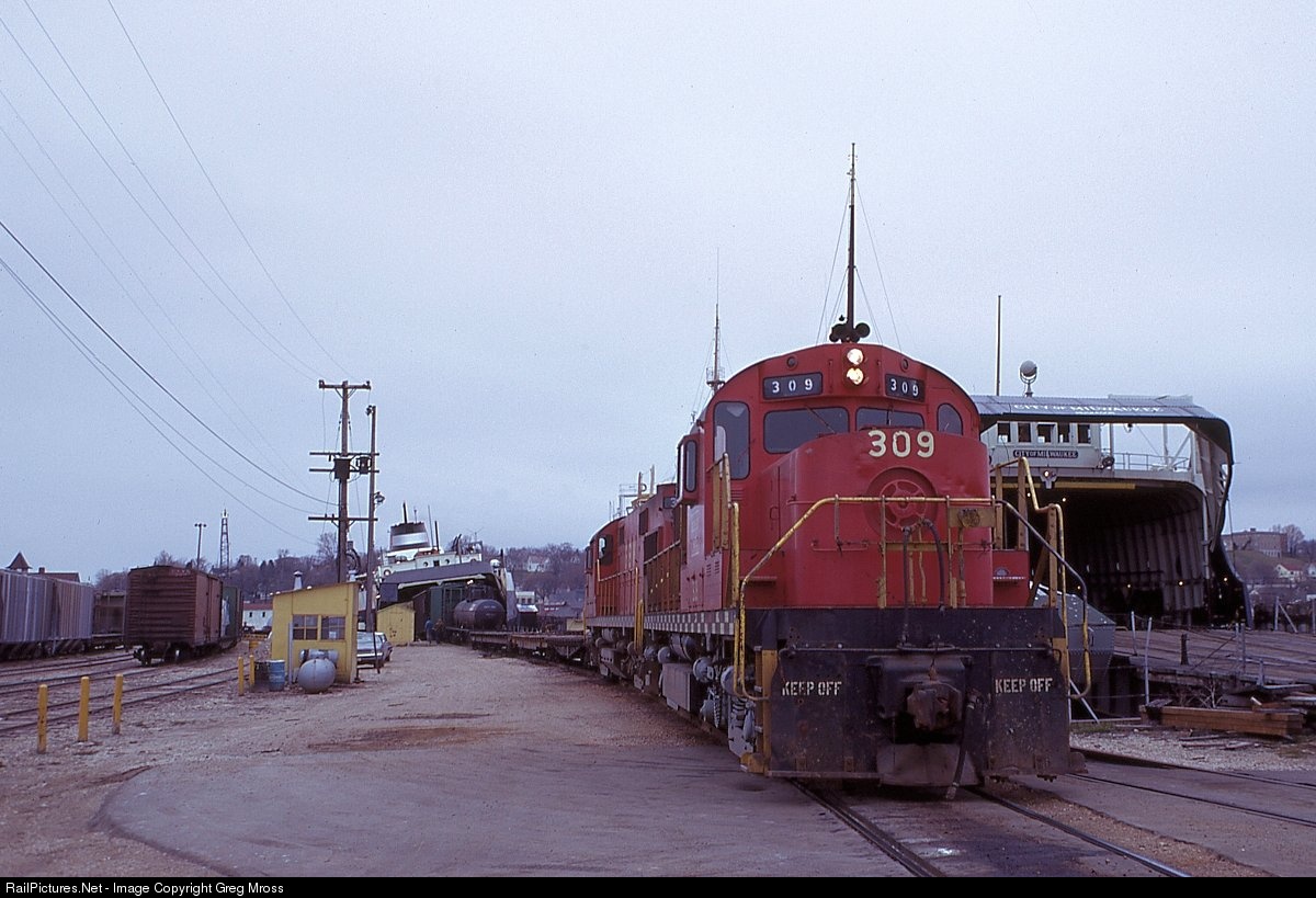 Both ferries are in as GBW 309 goes about it's chores switching the boat train in Kewaunee, WI in May of 1973. Russ Porter original from my collection.