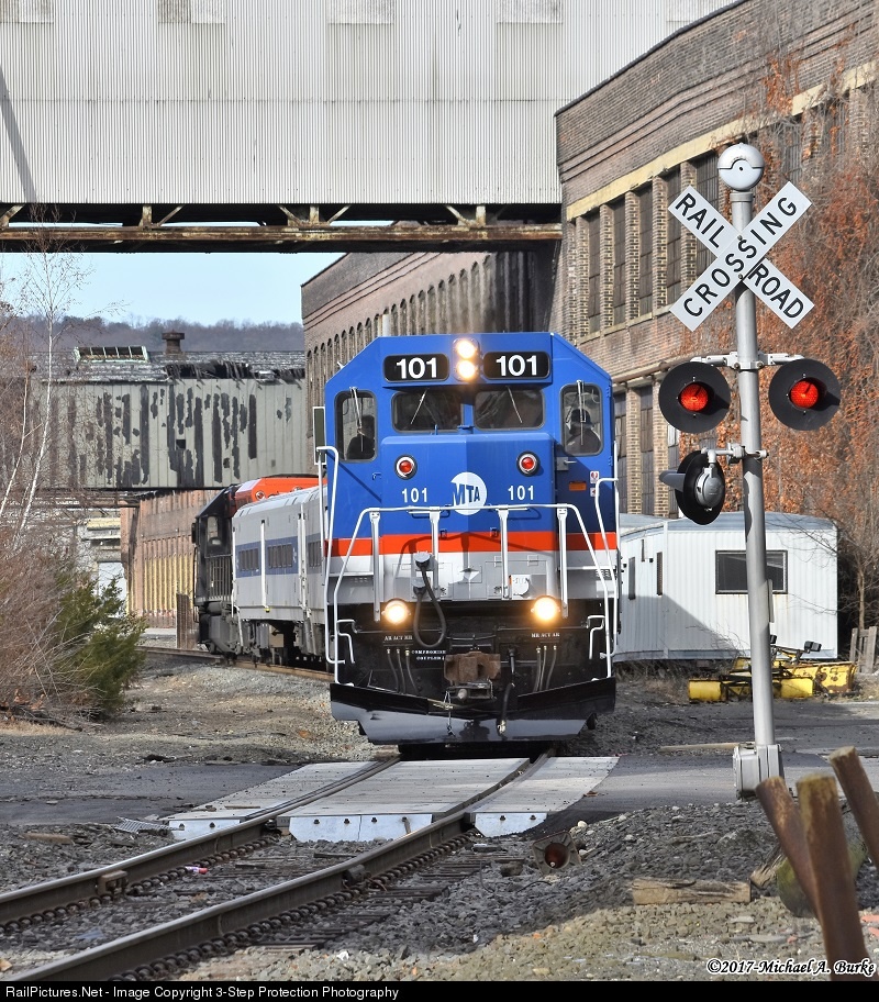 | Metro-North GP35R 101 brings a disabled Waterbury train south, passing the old Farrel Corporation factory in Ansonia. The veteran EMD was built in August of 1964 for the Reading Railroad and recently rebuilt by Brookville Equipment in Pennsylvania. |