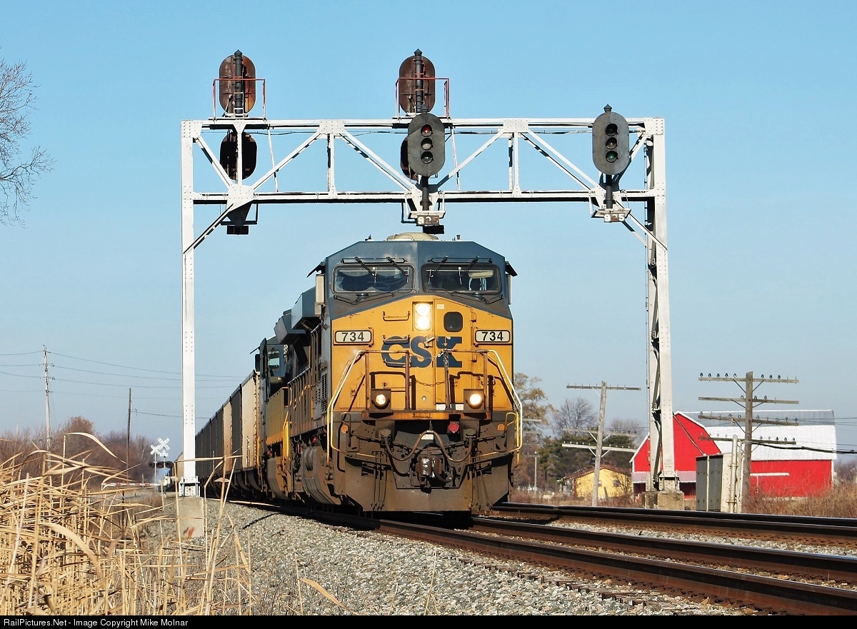 | A s/b CSX coal train passes under the C&O signal bridge near the US23 crossing north of Fostoria. These signals are extremely endangered as all of the underground wires have been marked off at all the signal locations on the Pemberville Sub meaning replacements are coming soon. |