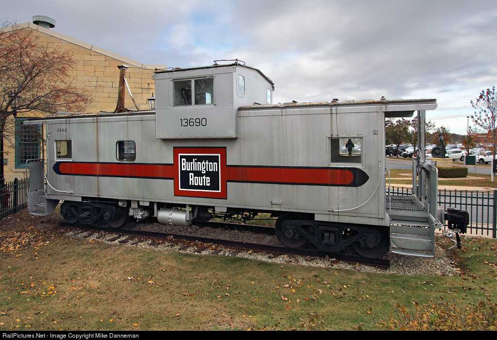A nicely-painted Chicago, Burlington & Quincy wide-vision caboose sits just outside the Aurora Transportation Center and alongside the Metra platform at Aurora, Illinois, on November 10, 2017. The ATC is right behind the caboose, and is an old shop building that survives (along with one of the roundhouses) from the expansive CB&Q shop facilities that once existed at this location.