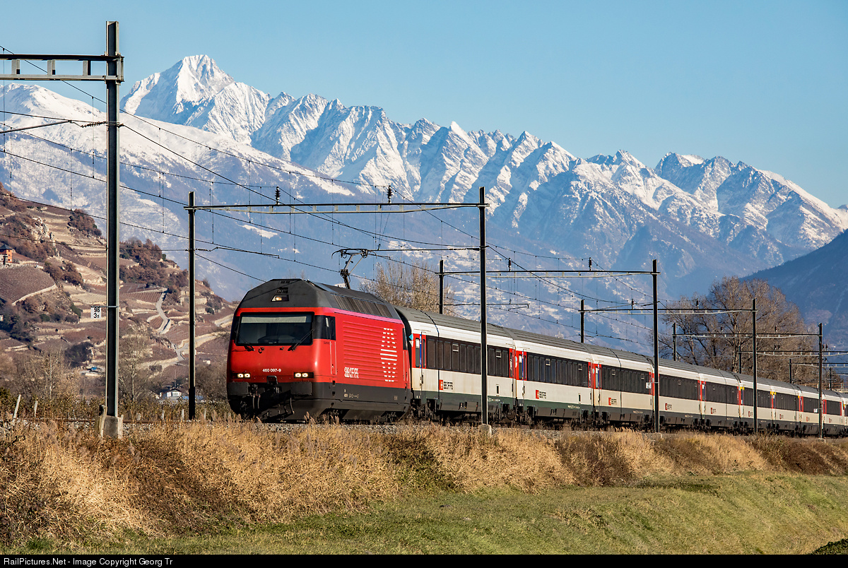 | Re 460 # 097 is pulling the Interregio service IR 1718 from Brig through the Valais to Geneva Airport, between St-Léonard and Sion, with the Bietschhorn in the background. |