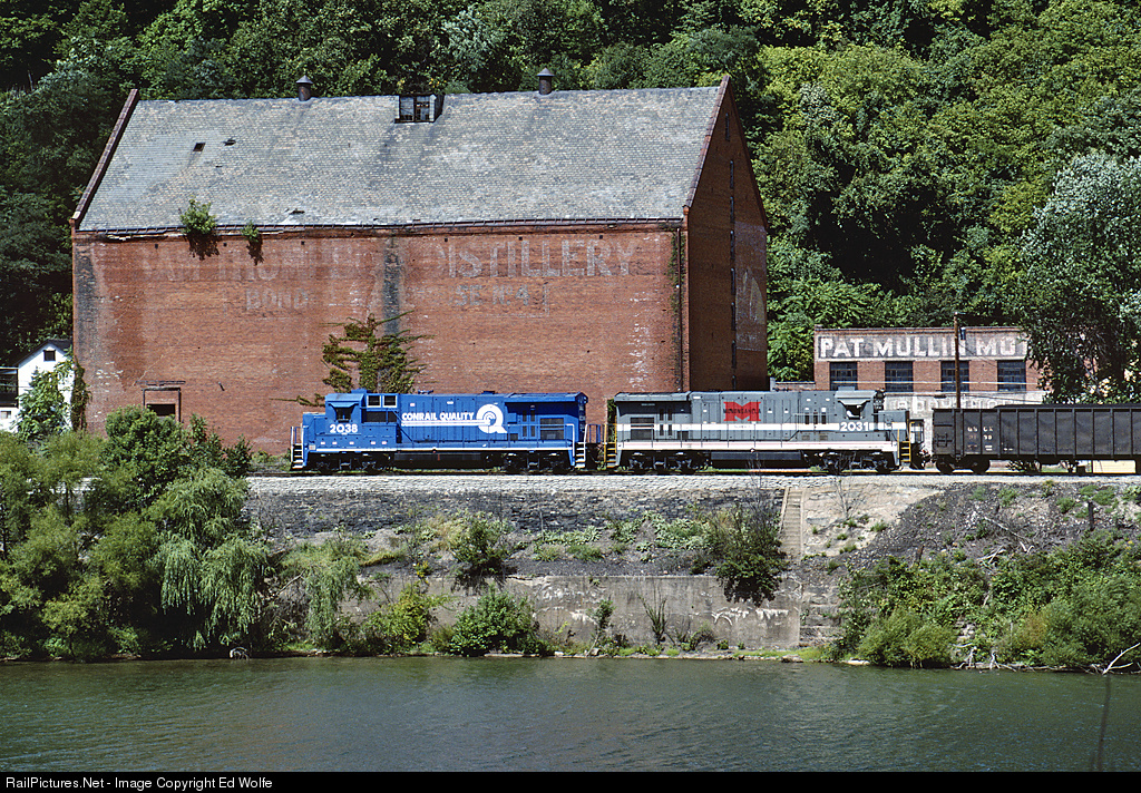 Freshly painted CR 2038, formerly MGA 2308, and CR 2031, still in MGA livery, are the pushers on CR 6435 North at West Brownsville. Remnants of West Brownsville's industrial heritage, Sam Thomas Distillery and Pat Mullin Motors, form the backdrop.