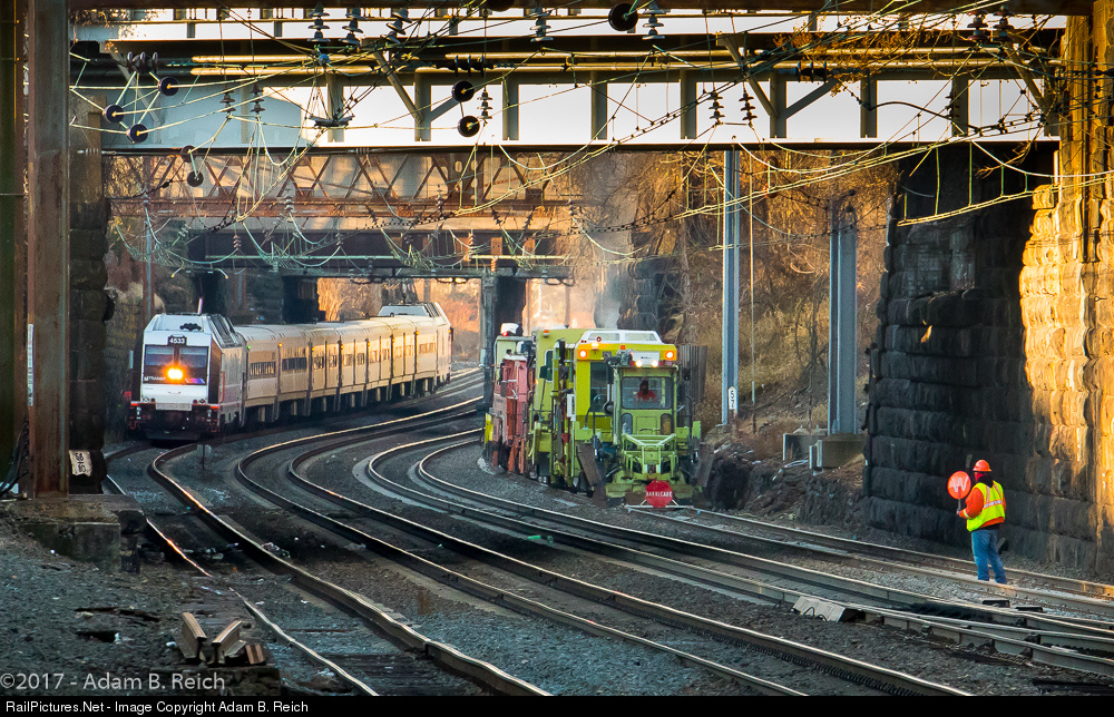 Good Morning from MP57: Northeast Corridor Line Train 3932 approaches Amtrak Maintenance of Way equipment and workers positioned just west of the Trenton Transit Center at Milepost 57 on Thursday, December 7, 2017. Note the unusual use of ALP-45DPs on the NJ Transit Train.