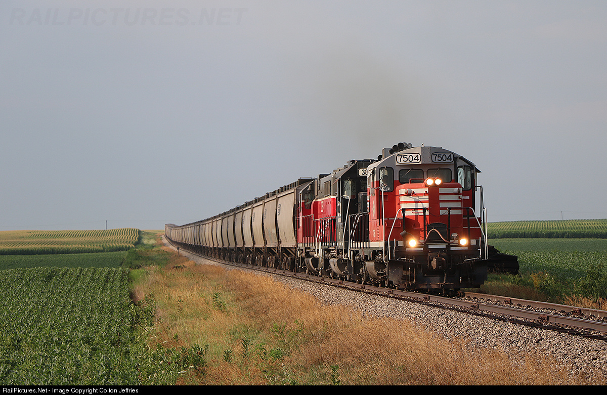 | Bloomer Line 7504, a ex-ICG GP10 leads a grain train over ex-IC rails in the morning light after a line of severe thunderstorms passed. |