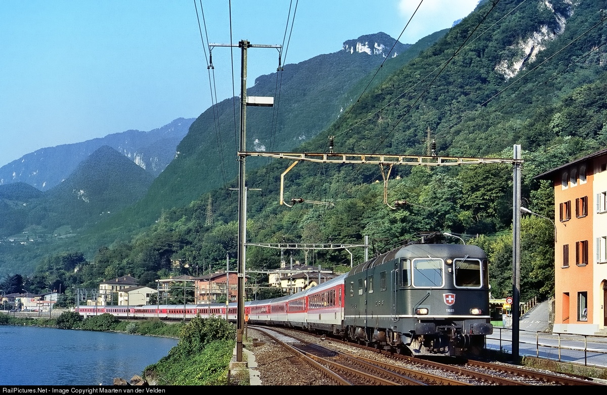 | SBB Re 6/6 11669 "Hagendorf" with EC 5 "Verdi" from Dortmund Hbf to Milano Centrale alongside the lake of Lugano. All the carriages still in old DB colour scheme.