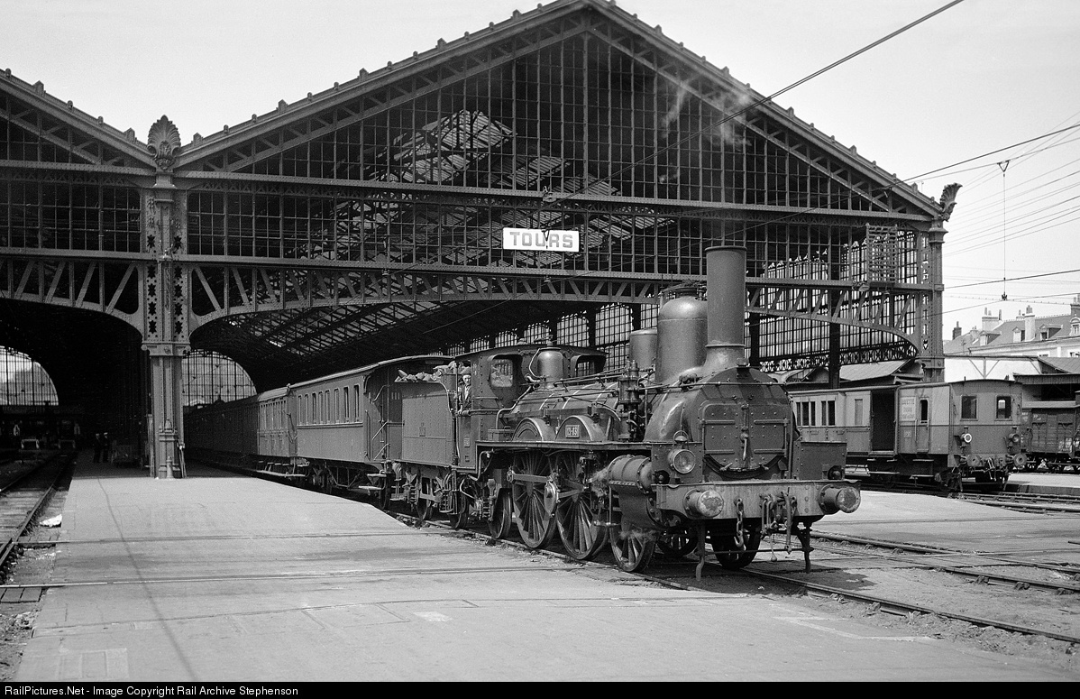 | A remarkable looking ETAT, former Ouest Railway, 2-4-2 waits to leave Tours with a train omnibus for Sarge in 1935. There were originally 120 of these locos built as 2-4-0s in 1879-84 of which 20 were rebuilt in 1894 as 2-4-2s. Note the electric 'Navette' on the right which says 'Tours - Saint Pierre des Corps' on its side used to ferry staff to the locomotive depot there. Photo from a 116 size film negative taken by the late George R. Grigs. Scanned on a Epsom Perfection V850 Pro scanner. |