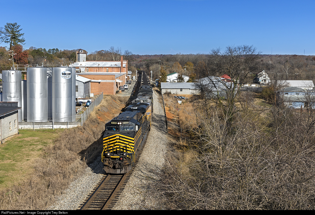 | The NS 8100 along with 4 other AC units lead a 128 car coal train south to Belews Creek. NS has been experimenting with running larger trains to Belews Creek in an attempt to reduce transportation costs for Duke Energy. 3 AC units on the head end along with 2 AC manned pushers are required to move this heavy train south on the curvy "Punkin Vine" |
