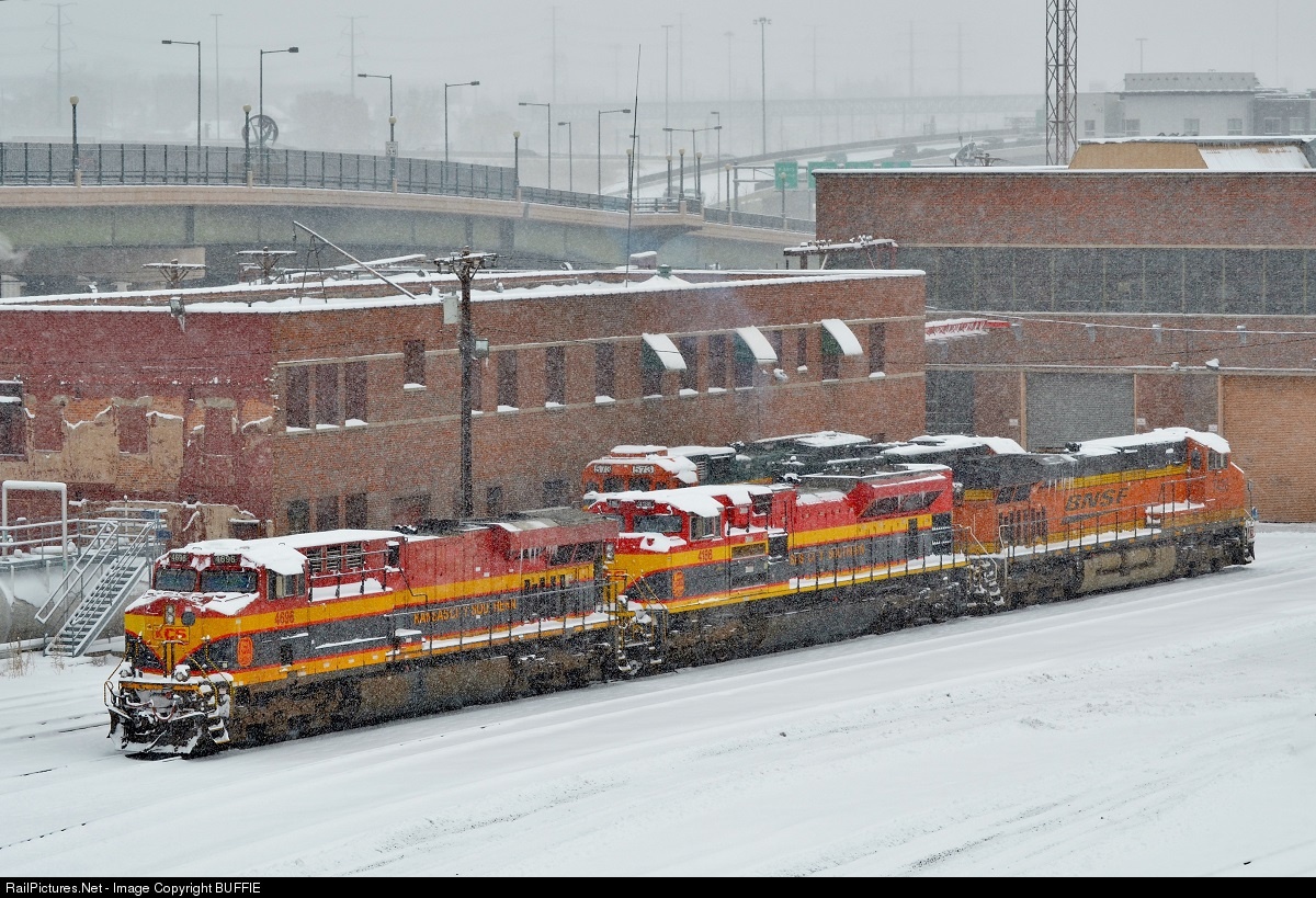 Two KCS engines hunker down at the Denver BNSF engine servicing facility during an intense snowstorm