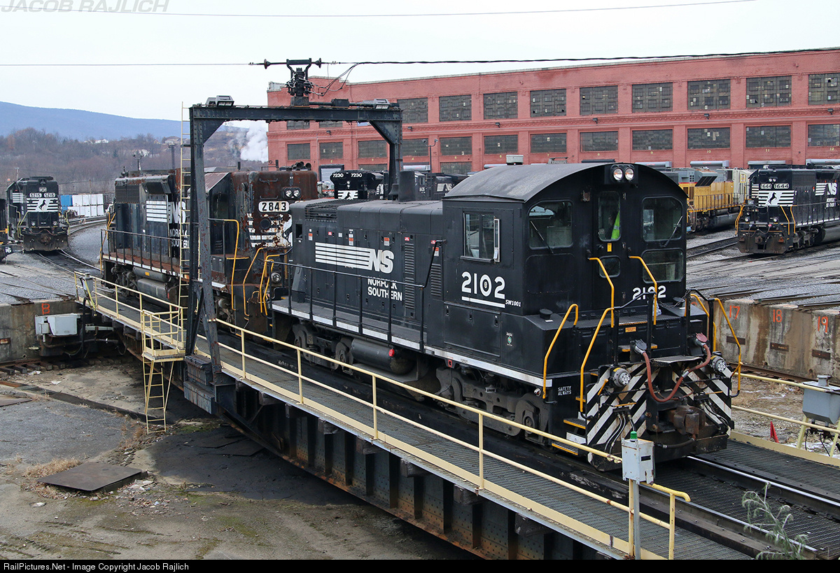 | NS SW1001 2102 pulls retired GP38AC 2843 onto the turntable before pushing it onto a shop track. It's not every day one can see two locomotives of this vintage together on a Class 1!