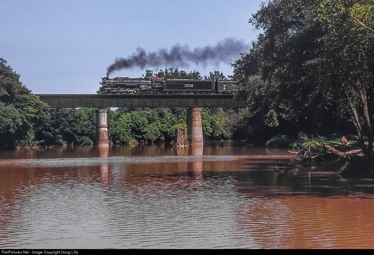 | Former Chesapeake & Ohio Kanawha 2716 looks just fine as it wheels a southbound excursion over the Rapidan River at Rapidan, Virginia. Unfortunately, this is one of its last runs before a cracked firebox is discovered. |