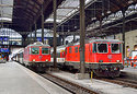 Two InterRegio passenger trains both hauled by a locomotive from the Re 4/4 class are awaiting for the departure.