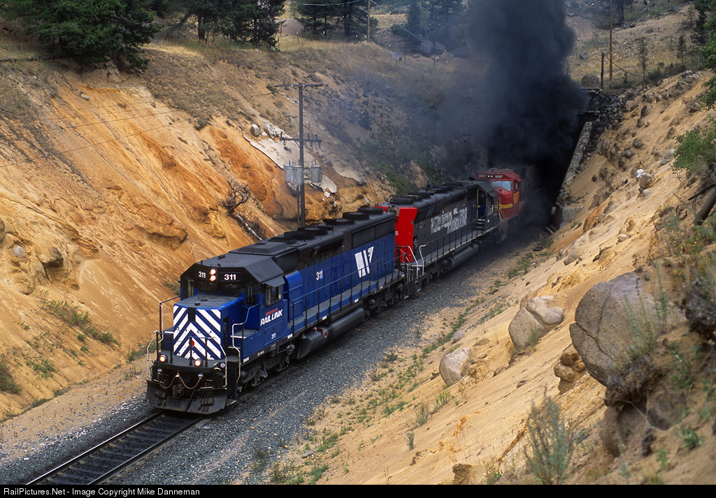 A westbound BNSF vehicle train thunders through Mullan Tunnel at Blossburg, Montana, on September 6, 2003. The train is led by a point helper of Montana Rail Link EMD SD45-2 No. 311 and former Southern Pacific (obviously) SD45 No. 7555. MRL calls these point helpers “unmanned” helper sets as they utilize the road crew that was once in the cab of BNSF 8207 upon arriving at Helena. These locomotives are normally set out on the west side of the pass at Elliston, for another train or helper set to pick up and take back to Helena. They smoke it up pretty good coming through the confining bore at the summit of Mullan Pass.
